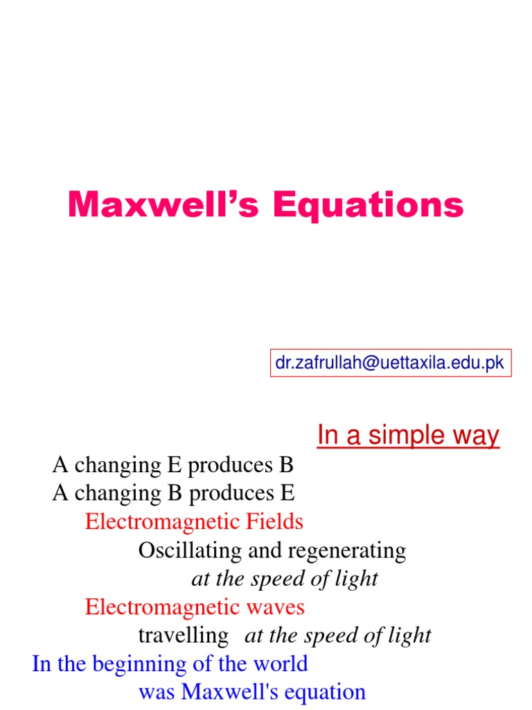 The next simplest form of the constitutive relations is for simple homogeneous isotropic dielectric and for magnetic materials: Maxwell's equations provide a complete description of electromagnetic phenomena and underpin all modern information and communication technologies. They were a synthesis of what was known at the time about. This section is full of advanced mathematics. Maxwell's equations imply conservation of charge. James clerk maxwell james clerk maxwell, born in edinburgh scotland 1831 is renowned for his work on the set of equations named after him. Physicists are fond of abstracting concepts into mathematical expressions and operators. James clerk maxwell collected all that was known about electricity and magnetism and summarized it in 4 equations. Solutions to maxwell's equations, as retarded or advanced potentials. A look at the equations through the years. Maxwell's equations unify electricity and magnetism dynamically (1864). Michael fowler, physics department, uva. Maxwell's equations are a set of coupled partial differential equations that, together with the lorentz force law, form the foundation of classical electromagnetism, classical optics, and electric circuits.